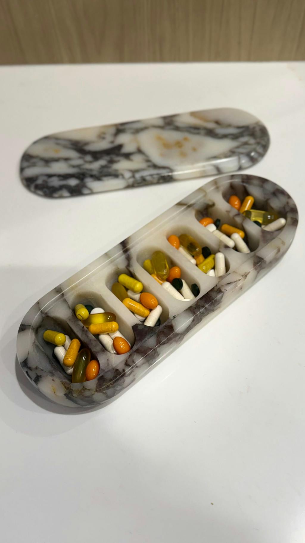 Crafted from our signature Calacatta Viola marble, this pill organizer transforms your daily routine into a beautifully elevated ritual.